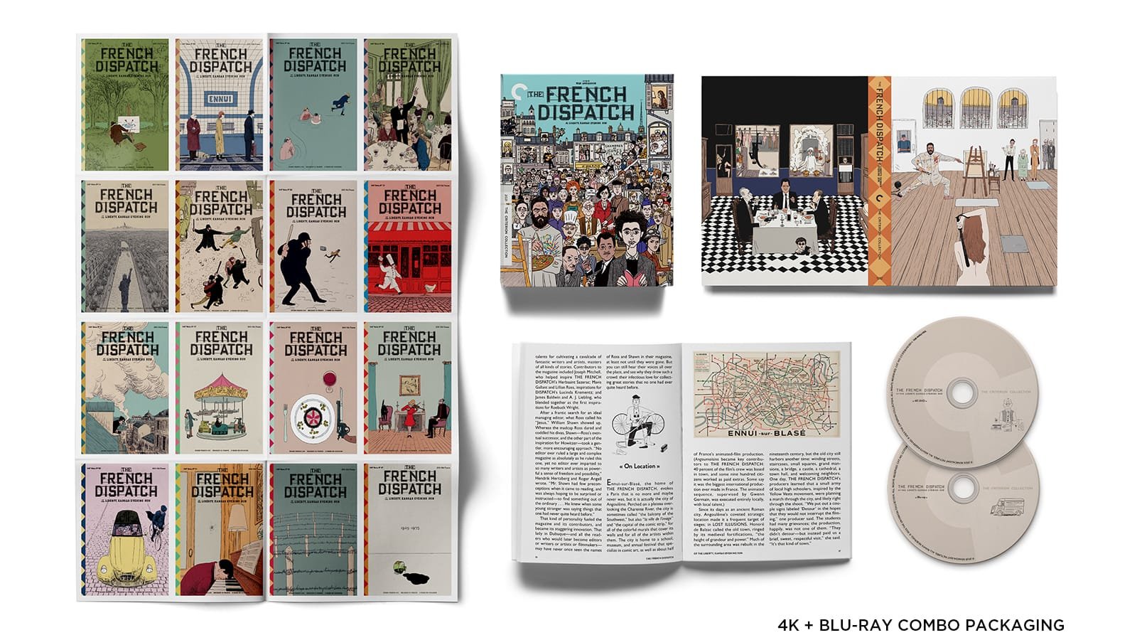 - PLUS: An essay by critic Richard Brody; excerpts from the limited-edition magazine issue of The French Dispatch, published to promote the film, including historical and production dispatches by writer Alex Pasternack and further-reading recommendations from Anderson; and a poster by Aznarez featuring the French Dispatch magazine covers created for the film